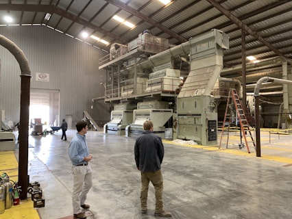 Agworld client, Dalby Rural and Steve McVeigh standing by packaging equipment